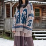 The flowing dress complements the cozy knit, while ankle boots add a modern edge.