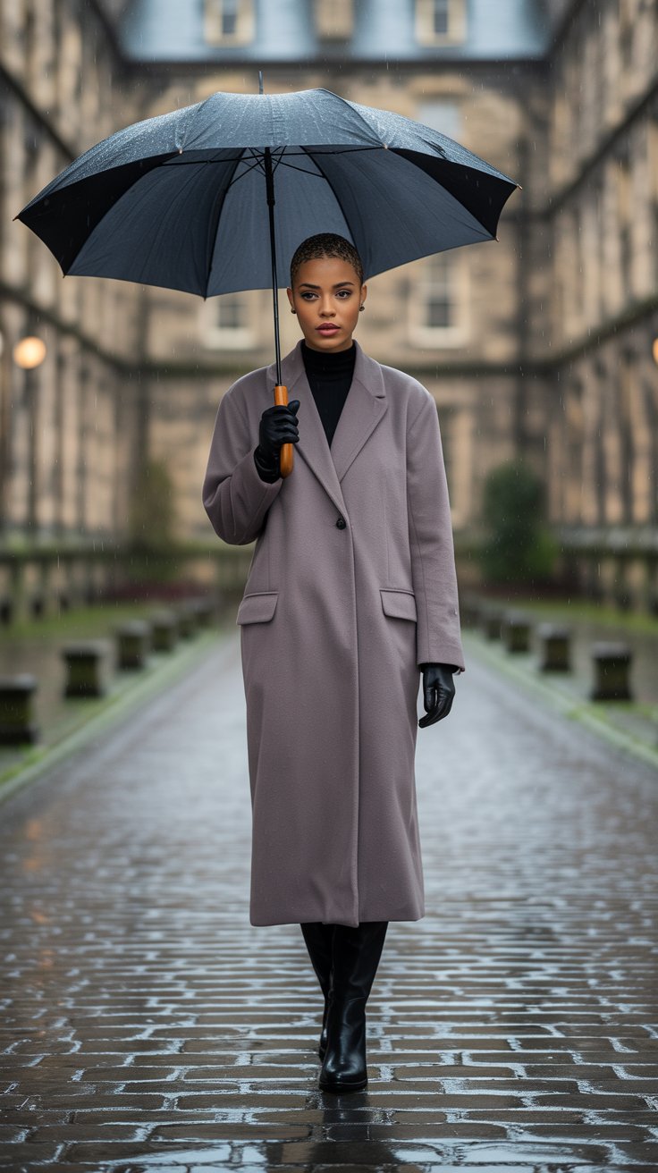 I love how this outfit feels both practical and luxurious—the kind of ensemble that lets you enjoy the rhythm of raindrops instead of rushing to get inside.