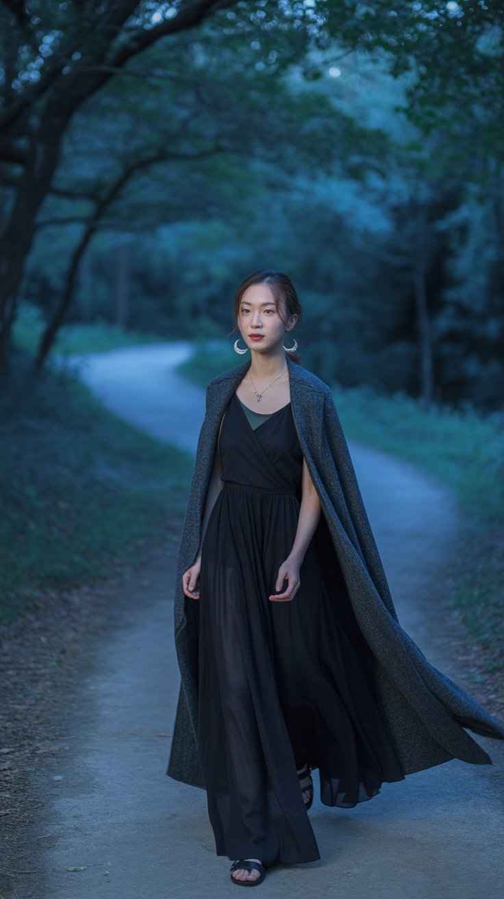 There’s something poetic about walking through a quiet forest at dusk in an outfit like this.