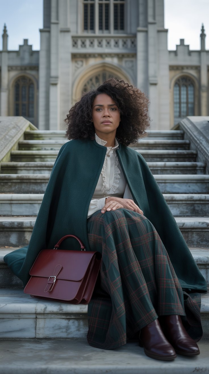 The long green cape has such presence without being overwhelming, and the plaid skirt brings that timeless academic charm.