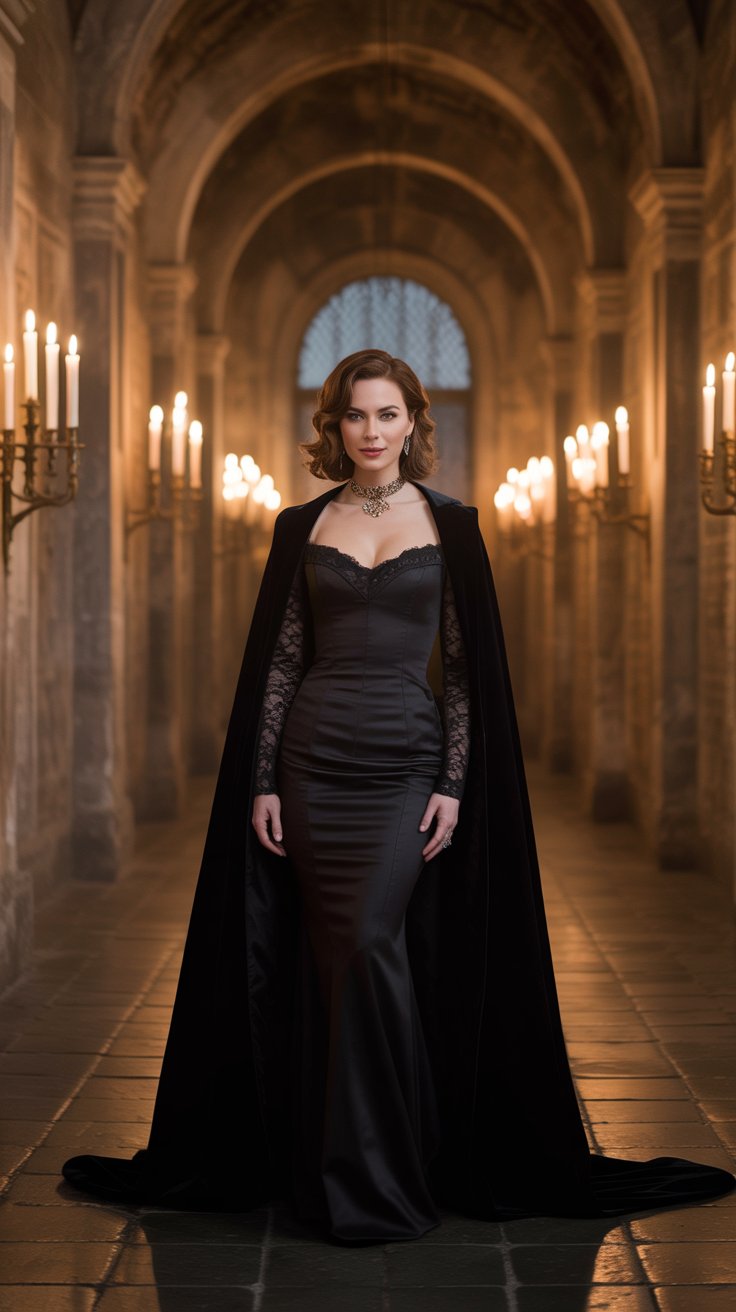 The black gown and velvet cape feel powerful and sensual all at once, like a love letter to old-world glamour.