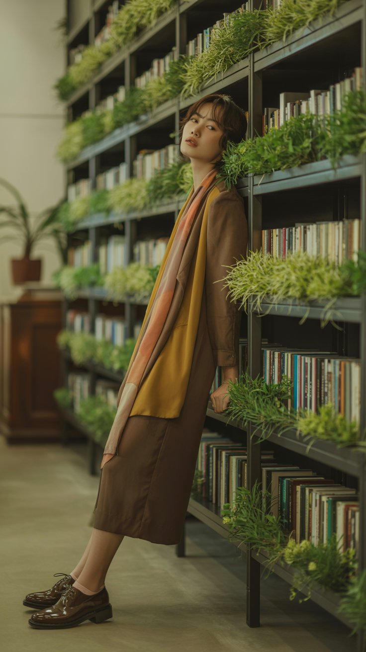 The earthy tones blend effortlessly, and the draped scarf adds a pop of personality without losing that intellectual charm.