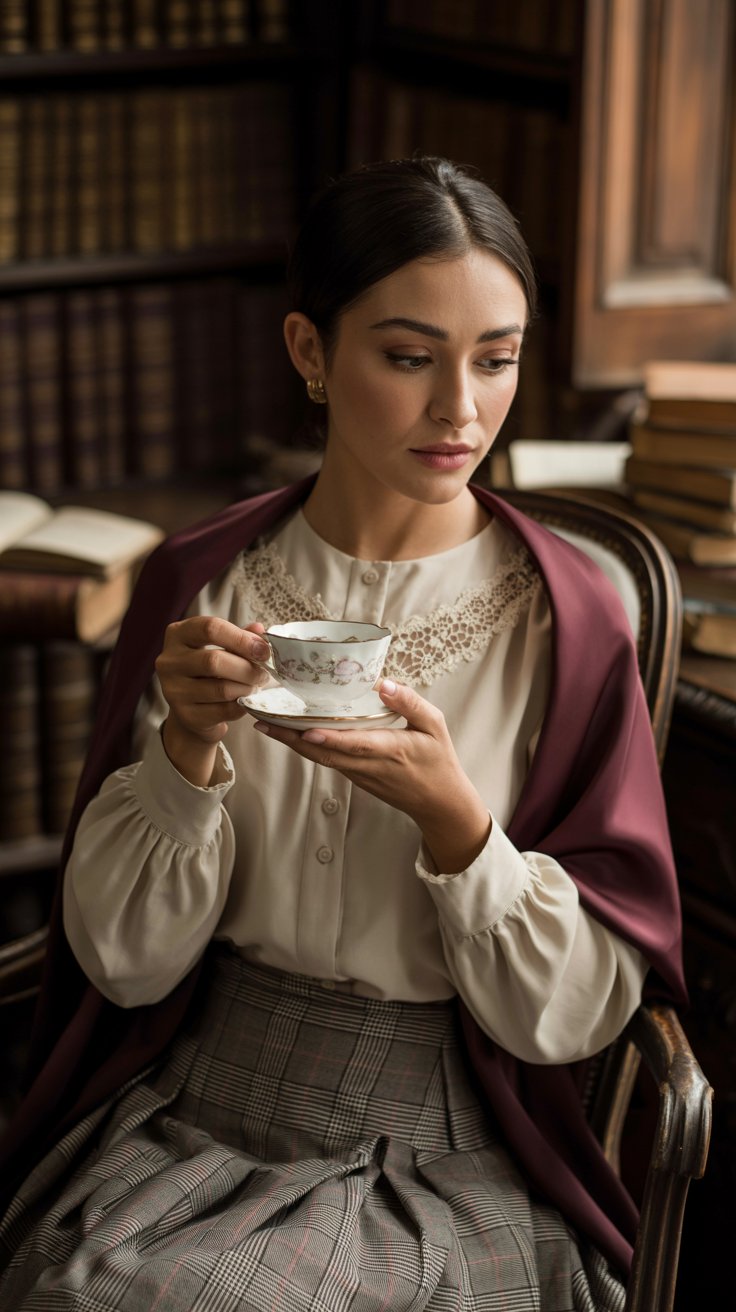 The soft blouse and plaid skirt create such a cozy and refined combination, and the shawl adds a touch of warmth that feels both vintage and fresh.