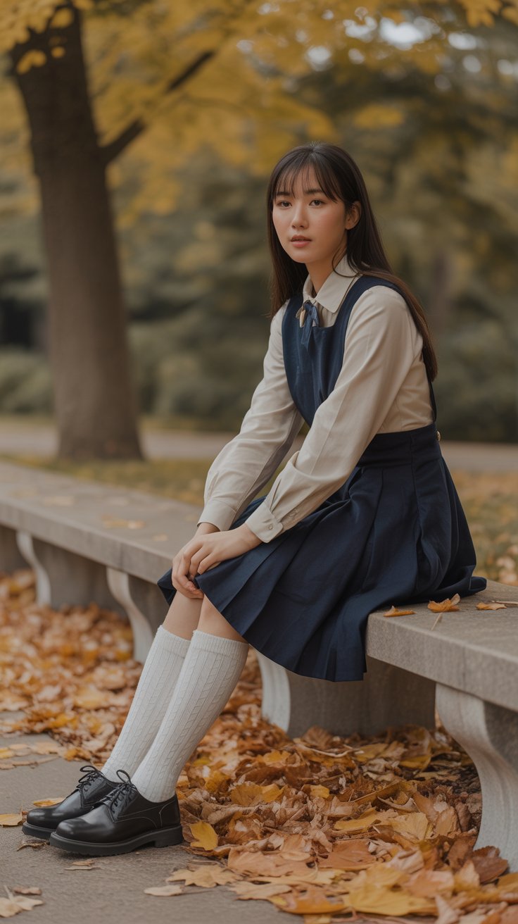 The pinafore dress layered over a blouse has that soft, nostalgic vibe that never really goes out of style.