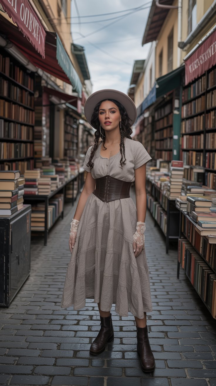 The corset dress adds structure while still feeling romantic, and the soft blouse underneath gives it an earthy, lived-in charm.
