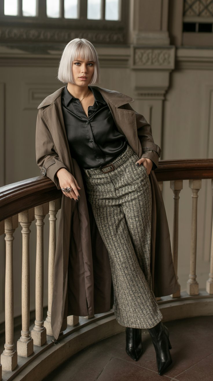 The mix of satin, tweed, and a long trench coat gives such rich texture—it feels both timeless and bold.